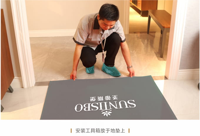 1、搬运之前现在客户家门前放置《开云电竞安装施工指示牌》,搬运和安装过程中避免发生碰撞和声响,控制说话声音以免惊扰客户家人或碰坏物品。送货安装服务人员在进入顾客家前,应穿上自备的鞋套。