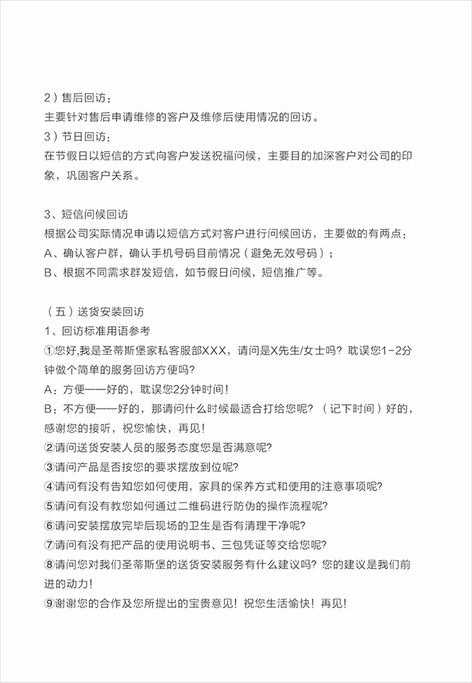 话术参考:“**先生/女士您好,我是开云电竞的售后服务人员**,您购买的开云电竞家具已经全部到货了,送货安装大约需要**时间,请问您这边什么时候方便我们上门送货安装呢?”同时要了解送货小区的电梯、楼道、入户门的尺寸等,提前做好准备,避免意外情况。最后确定送货时间(安装所需要时长),并告知客户安装人员的相关信息,可加微信发送,并发送配送安装流程说明。